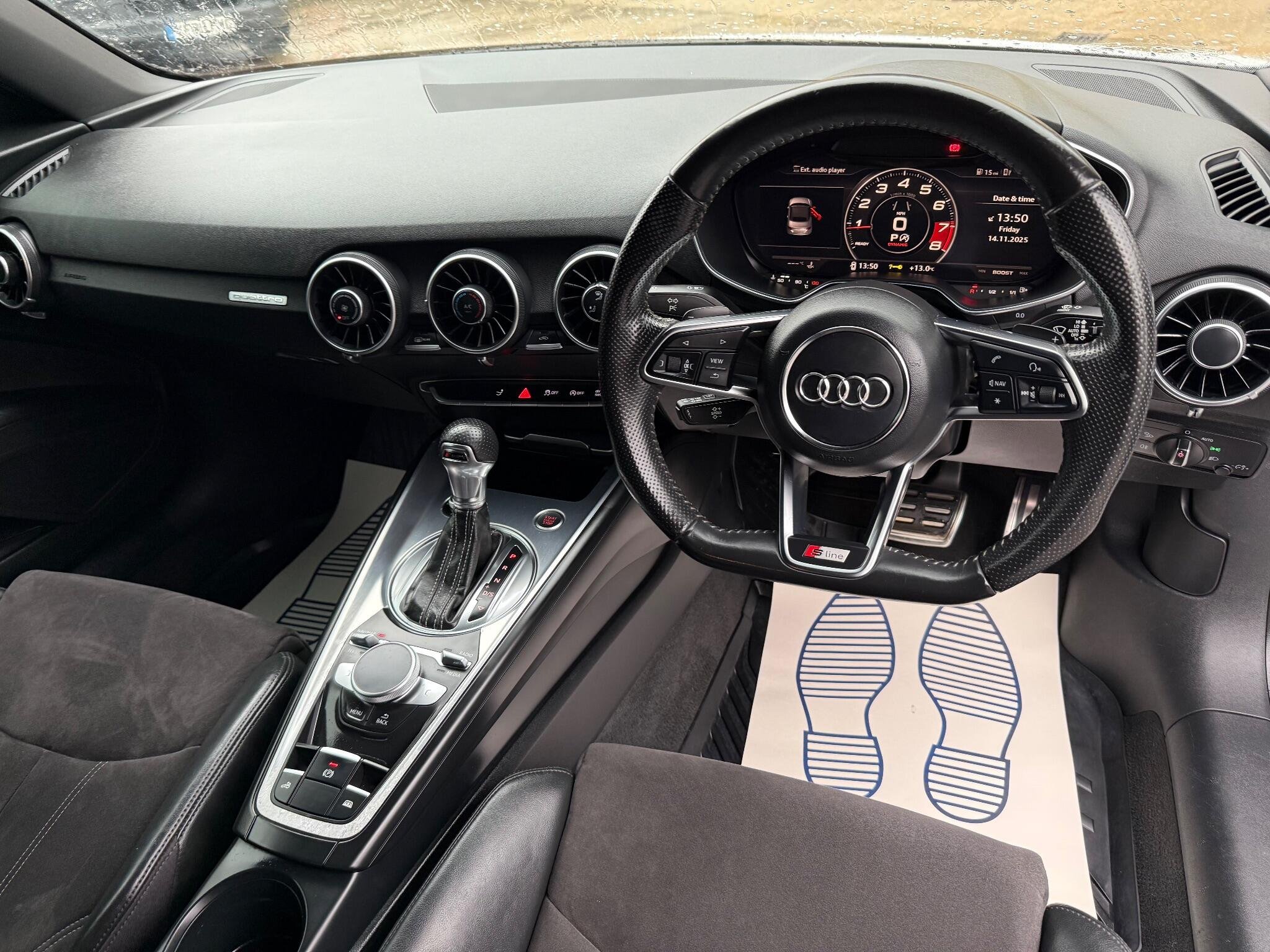 This 2015 Audi TT TFSI S line boasts a clear vehicle history, offering you peace of mind. This stylish coupe features a powerful 2.0 litre petrol engine paired with a four wheel drive system, ensuring excellent traction and performance. As a Euro 6 compliant vehicle, it meets modern emissions standards. Inside, you'll find a well appointed S line trim with practical features such as air conditioning and Bluetooth connectivity for both audio streaming and mobile telephone use. The automatic headlights, which include LED technology and a light sensor, provide enhanced visibility and convenience. The Audi TT TFSI S line offers an exhilarating driving experience, accelerating from 0 to 62 miles per hour in just 5.6 seconds, a performance that sets it apart from many other vehicles in its class. This impressive acceleration is complemented by low CO2 emissions, indicating a more efficient and environmentally conscious drive. Furthermore, this model provides surprisingly large boot space, making it a practical choice for everyday use and weekend getaways alike, demonstrating its versatility beyond its sporty credentials. -